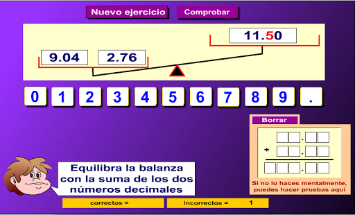 Aplicación para tablets android que genera ejercicios para practicar el cálculo mental de suma de números decimales. Mendiante un juego se debe equilibrar una balanza calculando el resultado. La aplicación corrige el rojo los errores.…